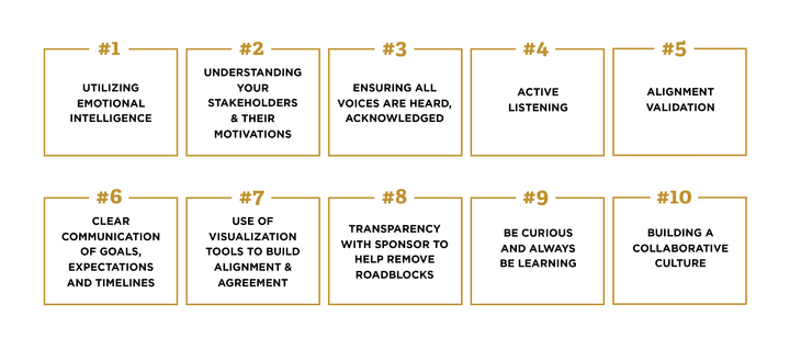 - Principles: Utilize Emotional Intelligence (EQ), Understand Stakeholders & Motivations